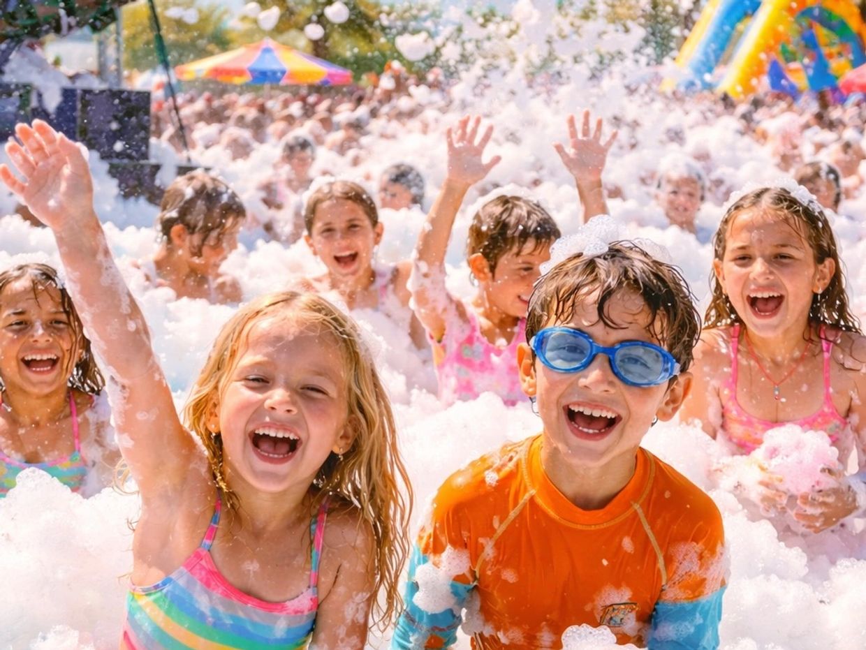 It's like being in a giant bubble bath but way more fun! The atmosphere is vibrant, filled with laughter and excitement as the foam floats around, making everyone feel like they’re in a magical world. Kids can jump, slide, and play in the foam.